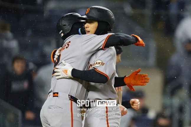 ▲ 샌프란시스코 자이언츠 한국인 메이저리거 이정후가 한국시간으로 12일 미국 뉴욕주 브롱스에 위치한 양키스타디움에서 열린 2025 메이저리그 뉴욕 양키스와의 방문 경기에서 3번타자 중견수로 선발 출전해 1회초 무사 1,2루 찬스에 나와 우월 3점홈런을 터뜨렸다. 사진은 이정후가 득점에 성공한 뒤 윌리 아다메스와 포옹을 나누는 장면이다.