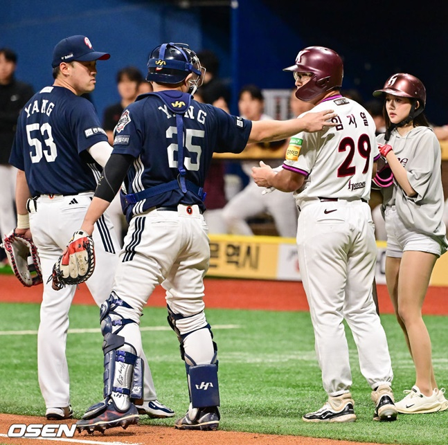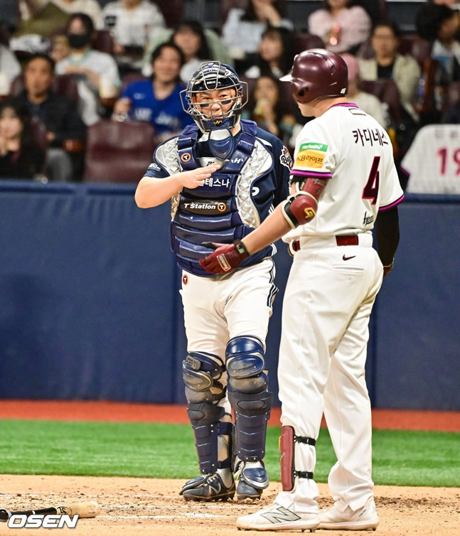 카디네스(오른쪽)도 4회말 김유성의 연이어 몸쪽을 향한 공에 불만을 표하자 양의지가 달래고 있다.공교롭게도 김유성은 키움에 또 다른 아픔을 안겼던 선수다. 지난달 15일 시범경기에서 키움 김동엽(35)은 김유성의 직구에 오른쪽 손목을 맞고 쓰러졌고 손목 골절 진단을 받아 이탈해 있는 상황이다.다만 김유성은 이날 내내 제구 난조를 겪었다. 2회 푸이그의 몸에 맞는 공 이후 임지열의 타석에서도 몸쪽으로 향하는 공을 던졌다. 임지열은 2번째라며 김유성에게 불만을 표했고 양의지와 양석환이 임지열을 달래는 모습도 포착됐다. 4회에도 카디네스가 연이어 몸쪽으로 향하는 공에 놀라며 불만을 나타냈다. 이번에도 양의지가 고의가 아니었다며 카디네스에게 설명하기도 했다.