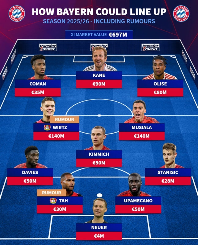 축구 통계 매체 '트랜스퍼마크트'는 14일(이하 한국시간) 사회관계망서비스(SNS)를 통해 다음 시즌 뮌헨의 예상 베스트 11을 공개했다.