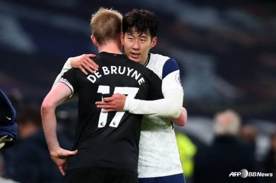 손흥민과 케빈 더 브라위너가 포옹하고 있다. /AFPBBNews=뉴스12015년 볼프스부르크에서 맨시티 유니폼을 입은 더 브라위너는 10시즌째 뛰고 있다. 맨시티에서 전성기를 보내며 월드클래스 미드필더로 거듭났던 그는 지금까지 공식전 413경기 출전 106골 164도움을 기록 중이다.