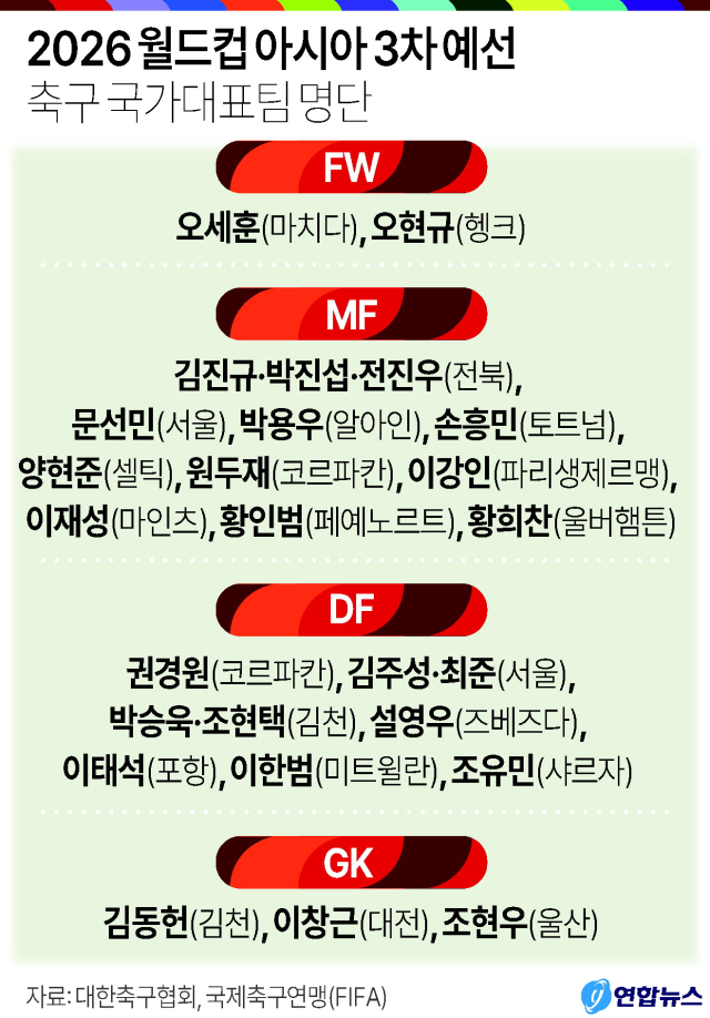 대표팀의 붙박이 센터백으로 활약해 온 김민재는 명단에서 빠졌다. 하지만 손흥민(토트넘), 이강인(파리 생제르맹), 황희찬(울브햄프턴), 황인범(페예노르트) 등 해외파들은 출전한다.