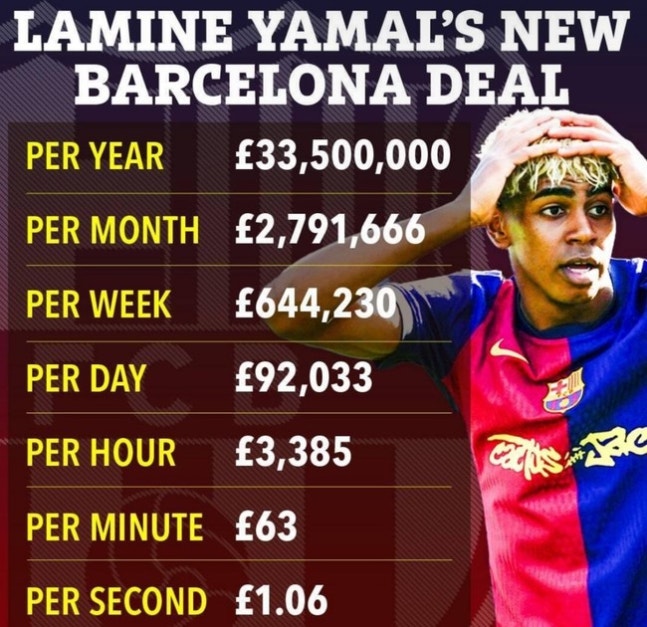 엄청난 연봉에 합의했다. 스포츠 매체 '디 애슬래틱'은 "야말은 바르셀로나와 재계약을 맺으면서 로베르트 레반도프스키 등 팀 내 최고 연봉 선수들과 어깨를 나란히 했다. 만약 보너스 조항이 모두 발동된다면 세전 기준 야말의 연봉은 4,000만 유로(약 620억 원)다. 바르셀로나는 18살이 되면 계약이 자동 연장되는 조건에도 엄청난 조건 속 재계약을 맺었다"고 전했다.