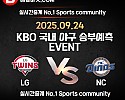 ★ 09월 24일[KBO] NC다이노스 VS LG트윈스 승/패★ 09월 24일 [KBO] NC다이노스 VS LG트윈스언더/오버★총 상금5,300P★승패/언더오버 를 정확히 맞춰주신…