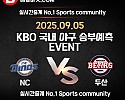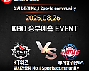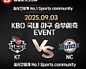 ★ 09월 02일[KBO] KT위즈 VS NC다이노스 승/패★ 09월 02일 [KBO] KT위즈 VS NC다이노스언더/오버★총 상금5,300P★승패/언더오버 를 정확히 맞춰주신 당…