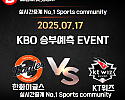 ★ 07월 17일[KBO] KT위즈VS 한화이글스 승/패★ 07월 17일[KBO]KT위즈VS 한화이글스언더/오버★총 상금5,300P★승패/언더오버 를 정확히 맞춰주신 당첨자 분들께…