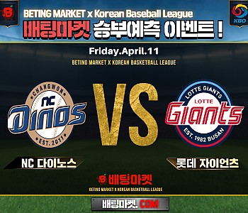 ★ 04월 11일 [ KBO ] NC 다이노스 VS 롯데 자이언츠 승/패★ 04월 11일 [ KBO ]NC 다이노스 VS 롯데 자이언츠언더/오버★총 상금5,300P★승패/언더오버 …