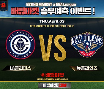 ★ 04월 03일[NBA] LA클리퍼스 VS 뉴올리언즈 승/패★ 04월 03일[NBA] LA클리퍼스 VS 뉴올리언즈언더/오버★총 상금5,300P★승패/언더오버 를 정확히 맞춰주신 …