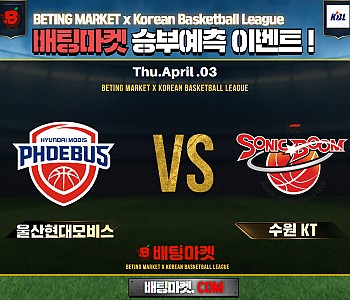 ★ 04월 03일[KBL] 울산현대모비스 VS 수원KT 승/패★ 04월 03일[KBL] 울산현대모비스 VS 수원KT언더/오버★총 상금5,300P★승패/언더오버 를 정확히 맞춰주신 …
