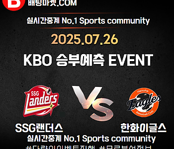 ★ 07월 26일[KBO] 한화VS SSG 승/패★ 07월 25일[KBO] 한화VS SSG언더/오버★총 상금5,300P★승패/언더오버 를 정확히 맞춰주신 당첨자 분들께규정에 맞게포…
