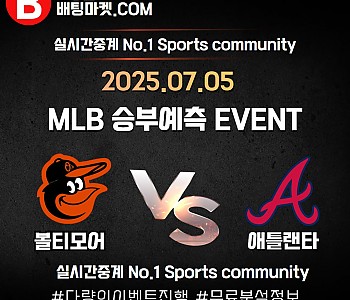 ★ 07월 05일[MLB] 볼티모어VS 애틀랜타 승/패★ 07월 05일[MLB] 볼티모어VS 애틀랜타언더/오버★총 상금5,300P★승패/언더오버 를 정확히 맞춰주신 당첨자 분들께규…