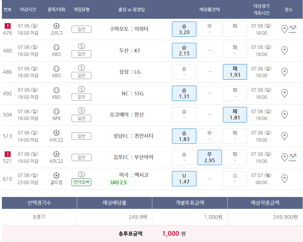 7월 6일 오후경기 고배당 249배 공유 ! 건승합시다